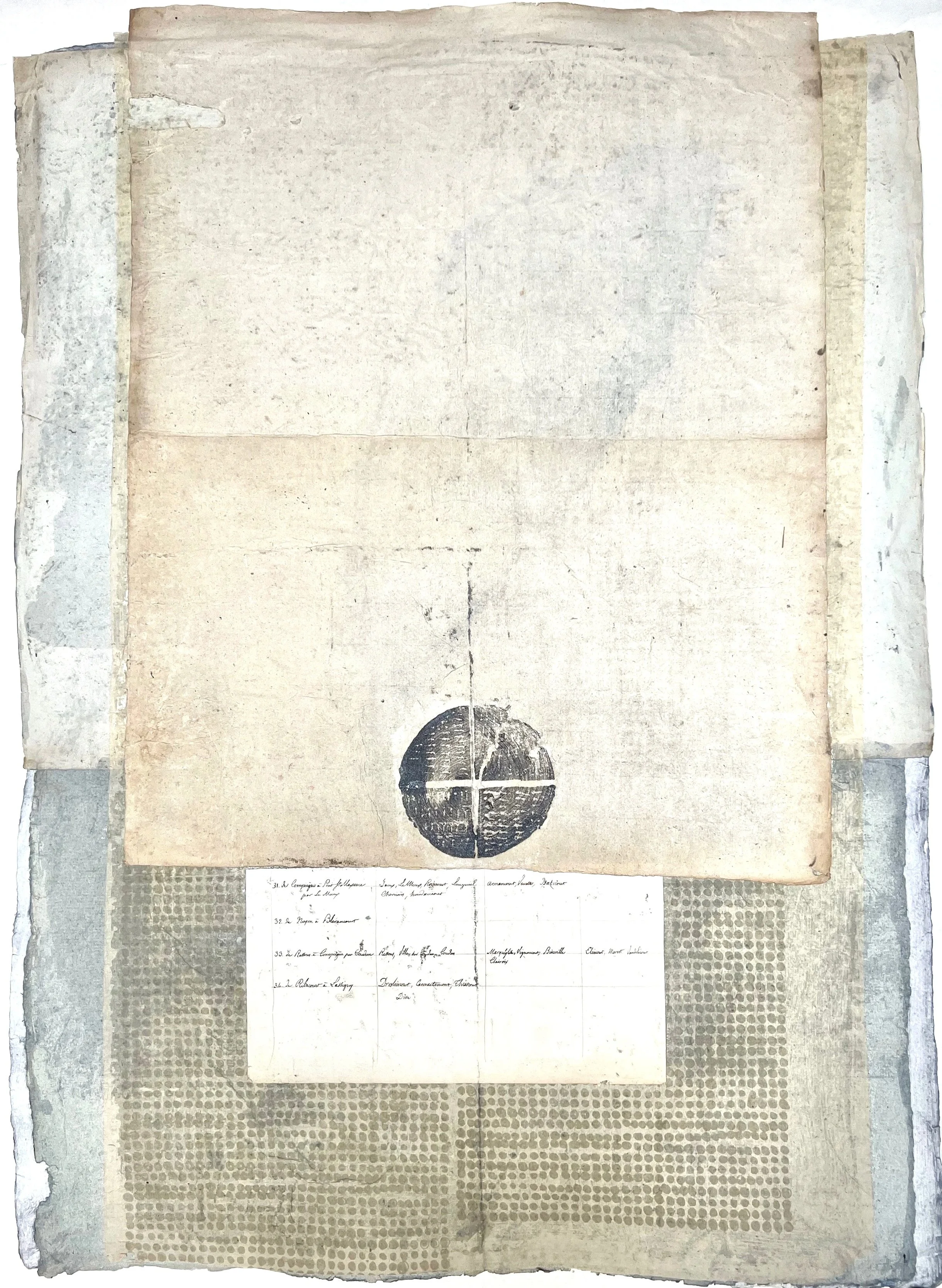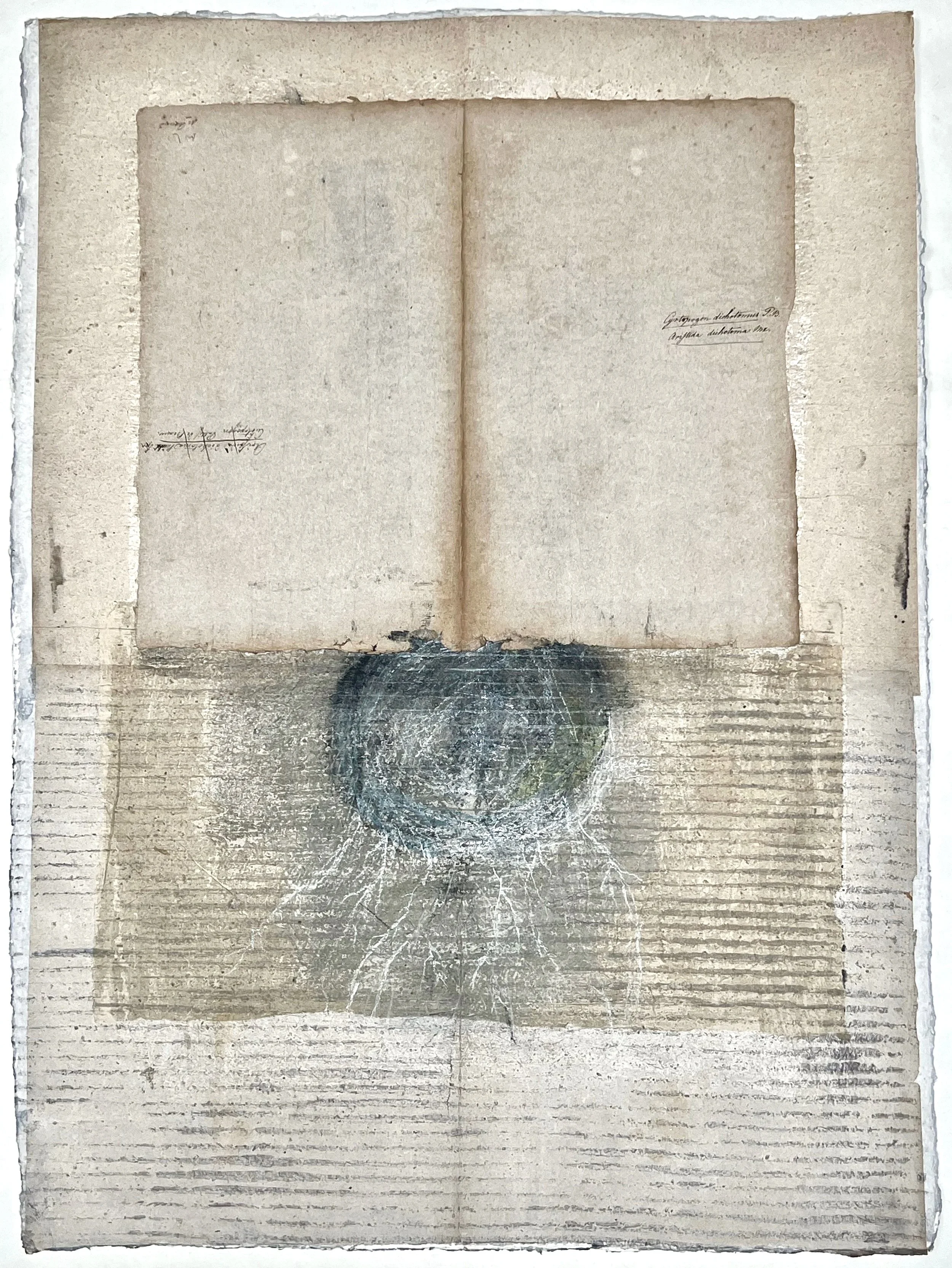 Paint, pencil, artist-made silk screen printing and block printing, layered paper from a dismantled vintage botanical collection. 22 x 30 inches.