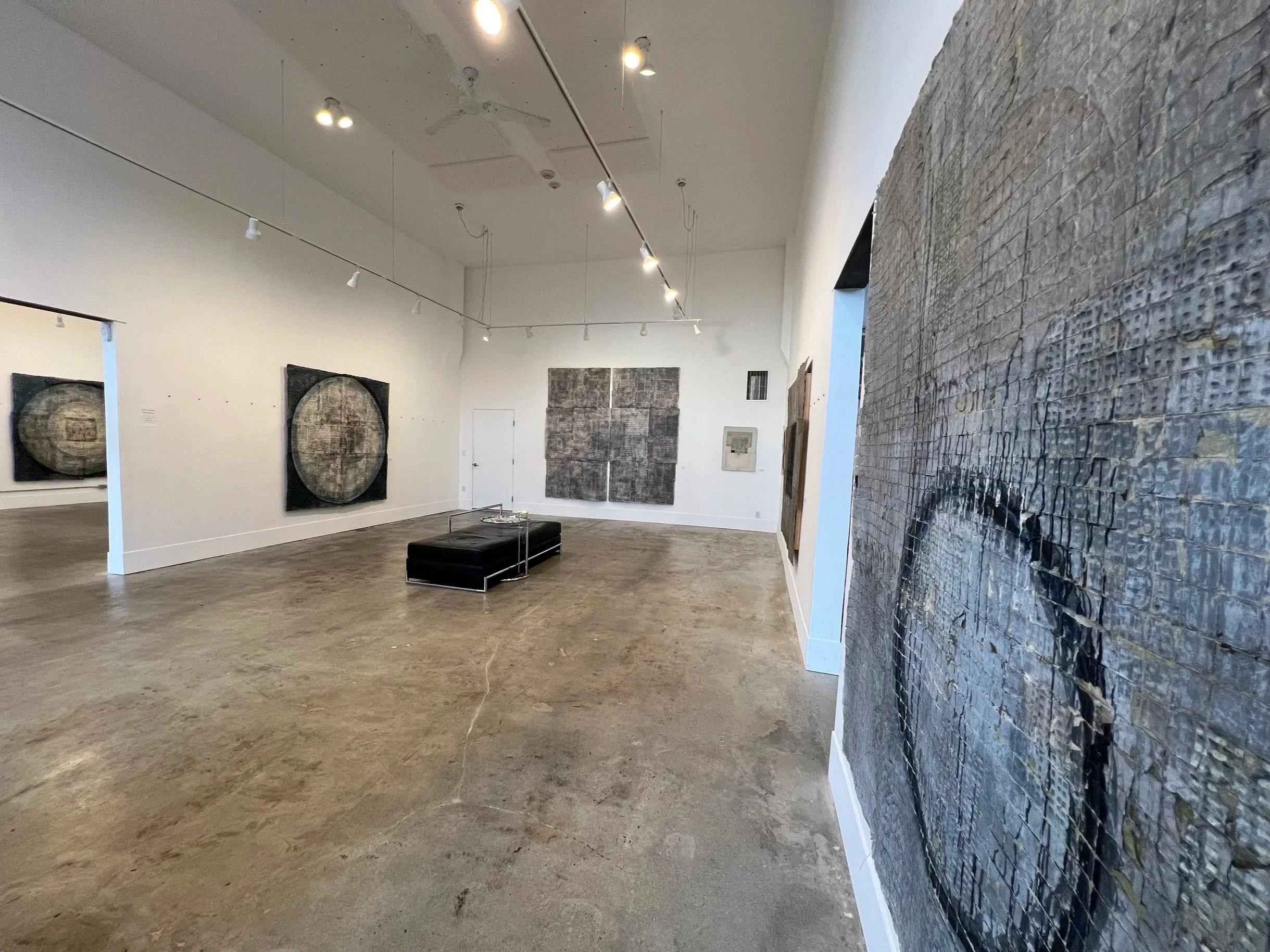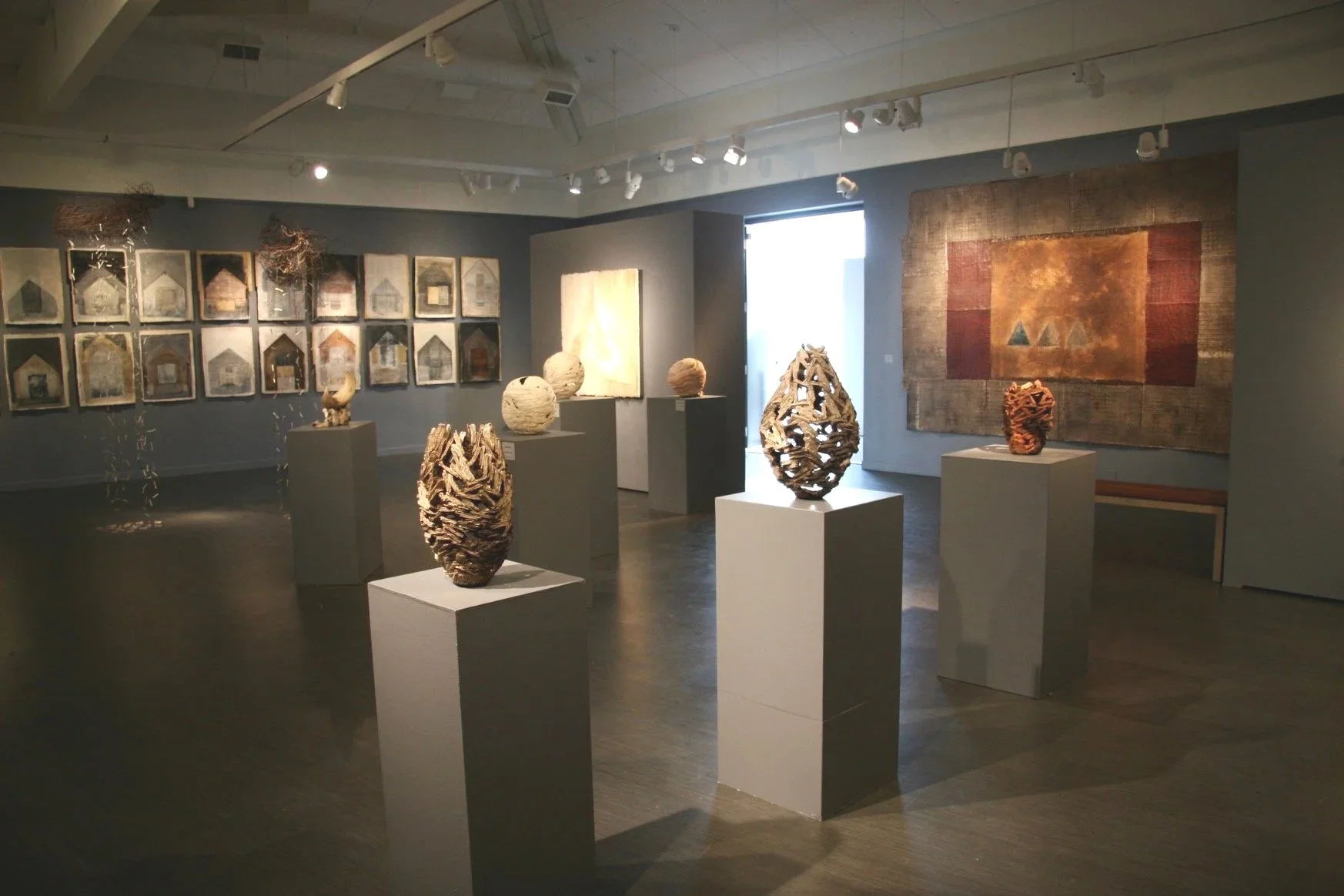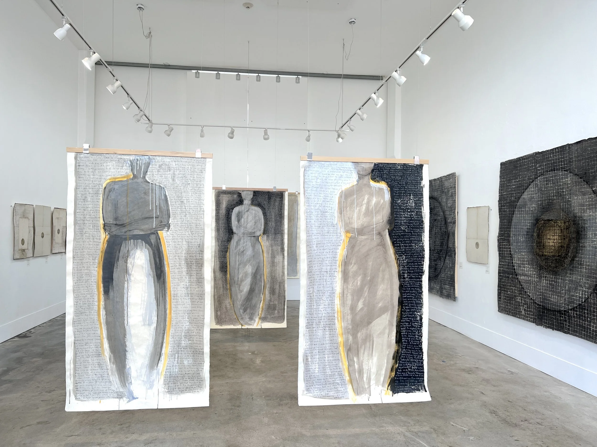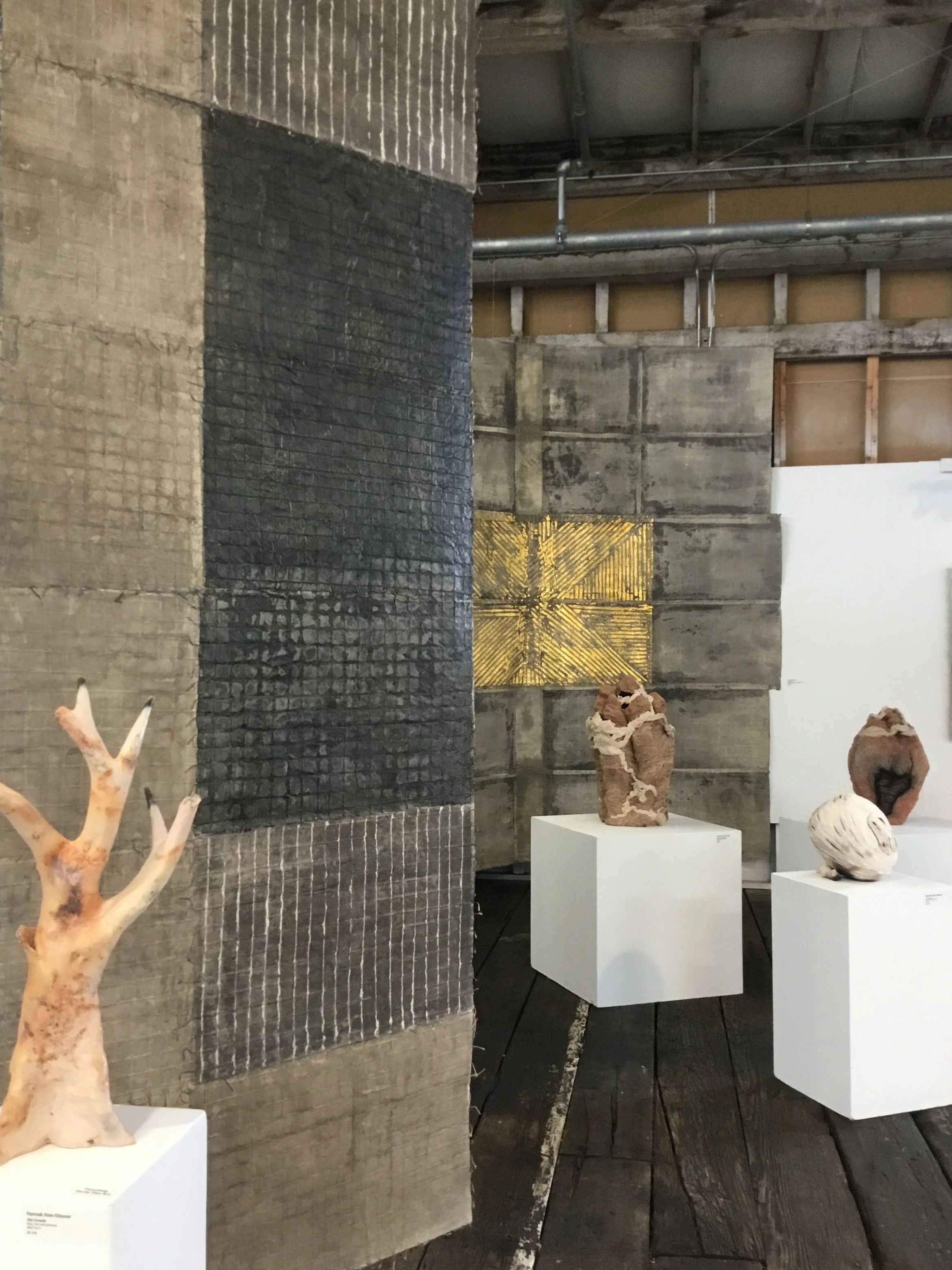 In this solo show at Perry and Carlson, the artist exhibited 4 shrouds, 6 ziggurats, and 4 vessels. The works were all created in what Singleton describes as a liminal state, a state of mind that is focused and conscious yet different than anything else in her experience. It may be close to meditation but it is not always reviving. It can be an unsettling process as the ideas and materials intersect. The artist holds this liminal state in high regard as a practice of passing through the thresholds of discovery.